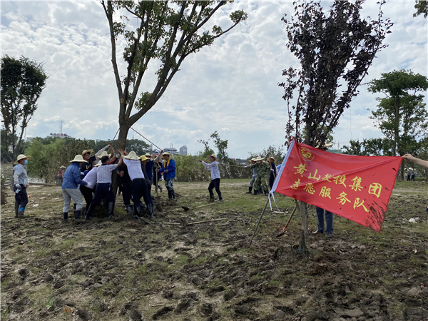受7·7洪水影响,歙县境内绿化树木出现大量倒伏。为与时间赛跑,抢救损倒树木,早日恢复城市美丽容颜,12日下午,徽投集团志愿服务队百余名队员前往绿化受损严重的歙州广场区域开展“扶绿”行动