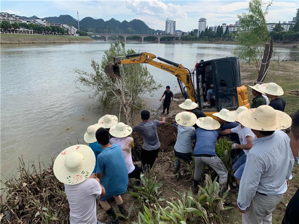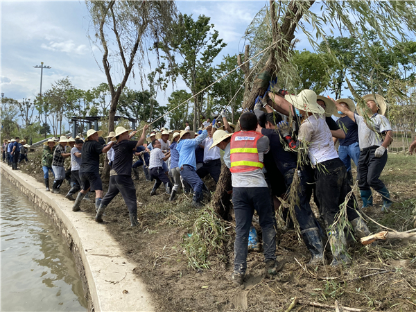 志愿者们喊着整齐的口号,一鼓作气,手推、绳拉、肩扛,全力将倒入河中、地上的树木扶正。在大家共同的努力下,一棵棵倒下的树木陆续站起,重新恢复生机。