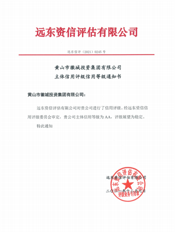 12月9日,黄山徽投集团公司成功获评2A信用等级,系我市区县唯一获评2A信用等级国有企业,将为歙县加快完善基础设施,加快产业招商和功能培育,打造高气质现代化文化旅游名城建设大平台提供坚实的融资保障。截至目前,集团总资产达135亿元,所有者权益73.9亿元。