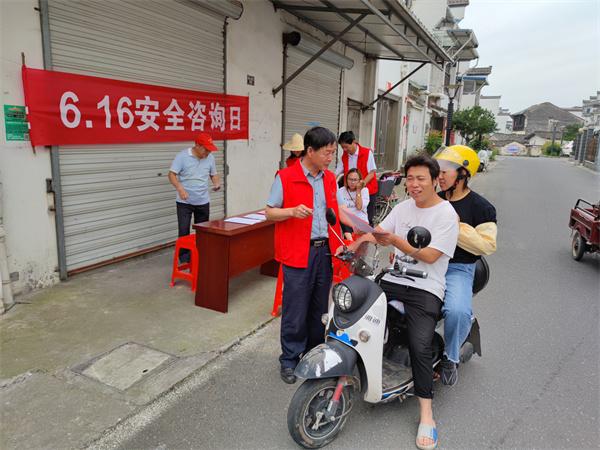 一大早,大家穿起红马甲,准时来到古溪安置区,在小区的主入口,拉起“6.16安全咨询日”横幅,抬出小桌子,摆上各类安全知识宣传资料。活动紧紧围绕“遵守安全生产法 当好第一责任人”的主题,对来来往往的小区居民发放宣传册,还上门入户发放防汛、防火、防诈骗等一封信和现场接受居民的安全知识咨询,现场为小区居民耐心讲解关于安全防汛、防灾减灾、消防安全、防电信网络诈骗、安全生产十五条措施等安全防范知识,整个活动共计发放宣传手册300余份。