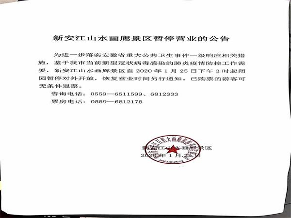 对公司下辖的新安江山水画廊景区自2020年1月25日下午3:00起实行全园关闭,随后分工部署了关闭后的一系列保障工作:对游客中心、售票大厅、洗手间、检票口、各个游船、子景点等区域进行深入消毒,每天安排工作人员进行景区内消毒和巡逻。